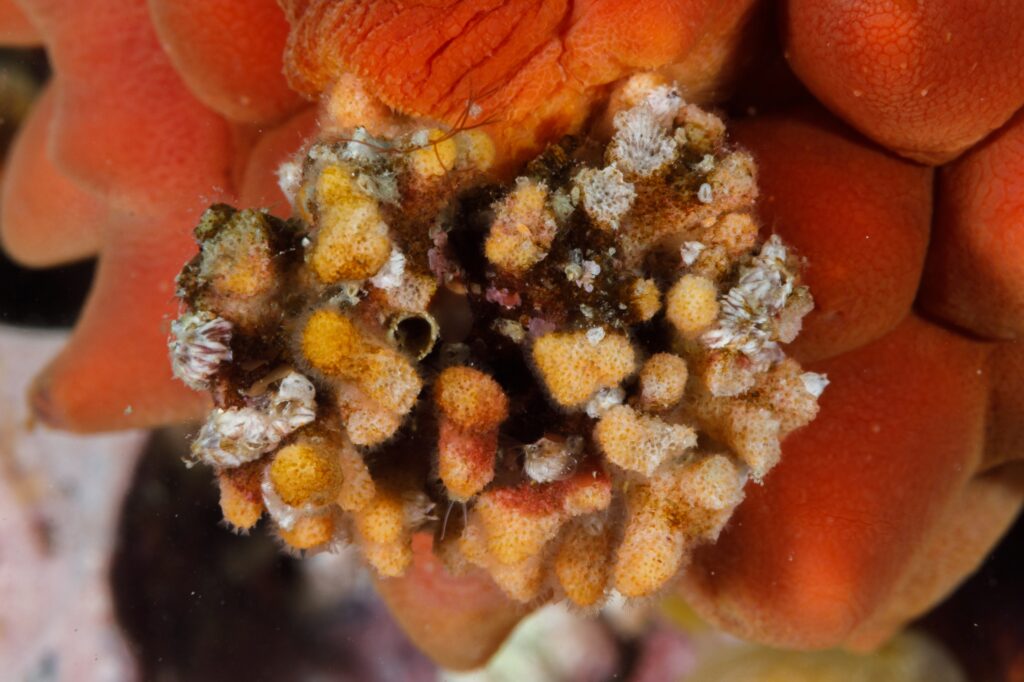 こちらは何かわかりますか〜? ホヤに寄生するサンゴです。これが入水/出水孔を塞いでしまってホヤが呼吸できなくなってしまいます。
