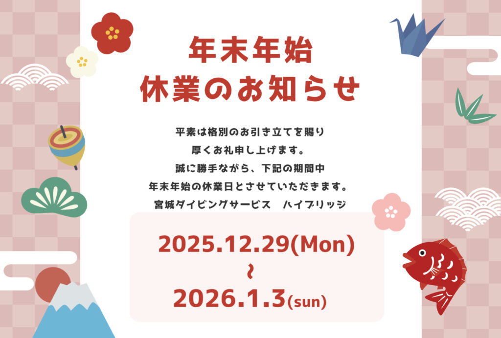 潜り納めは12/28 潜り初めは1/4予定 2025.12.25 お知らせ 年末は2025年12月28日が潜り納めで27日は空きございますよ。 2026年は1/4が潜り初めになります。 ご予約お待ちしてます。